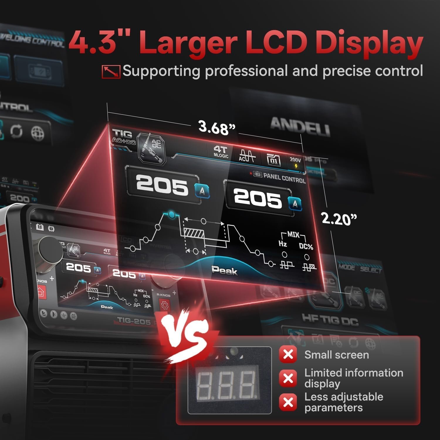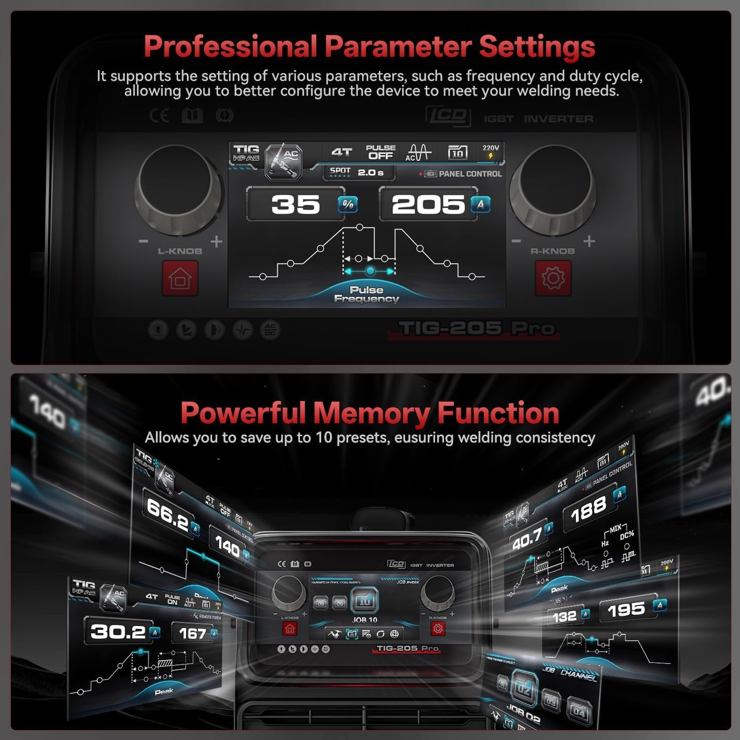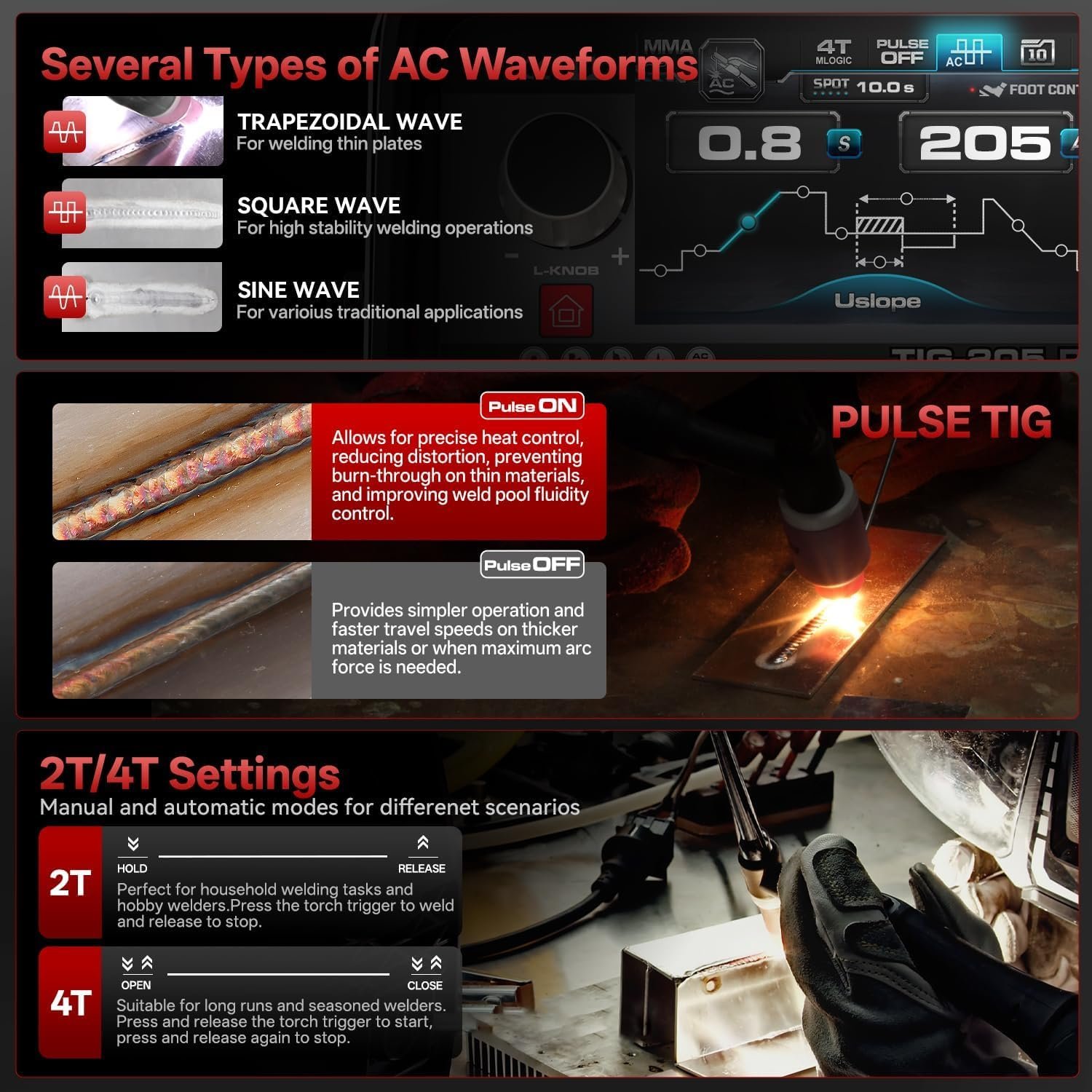 | Included Components | TIG-205 PRO ACDC,Foot Pedal*2, Aluminum TIG Torch*1,Cold TIG Torch*1, Tungsten electrodes * 20, Nozzle * 20, Collet * 20, Ground Clamp*1,Air Hose*1,110V~220V Adapter*1,Electrode Holder*1 |