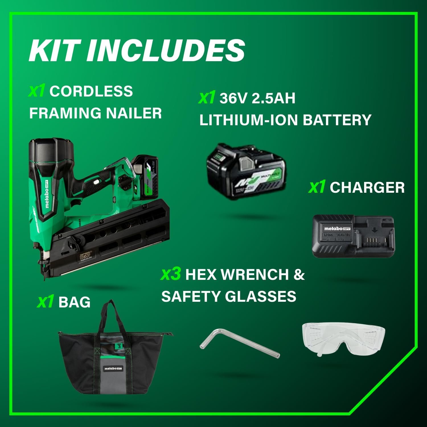 Metabo HPT 36V MultiVolt Cordless Plastic Strip Framing Nailer Kit, 21 Degree Framing Nailer with Power Tool 2.5Ah Lithium Ion Battery, Drives 2″ to 3-1/2″ Nails, NR3690DR