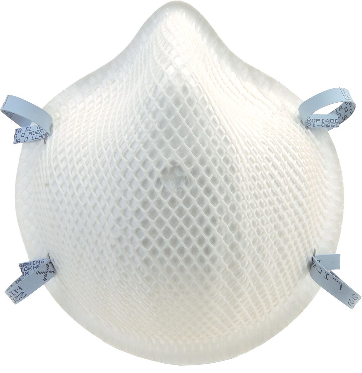 Dura-Mesh® shell protects filter media so it stays cleaner-looking longer. Shell resists collapsing, even in heat and humidity. Softspun® inner lining for added comfort and durability. Contour-molded nosebridge with soft foam nose cushion provides comfortable fit. No metal noseband to adjust. NIOSH certified for a filter efficiency level of 95% or greater against particulate aerosols free of oil. Meets heat and flame resistance in accordance with ANSI/ISEA 110-2003 Section 7.11.1. Sizes: M/L