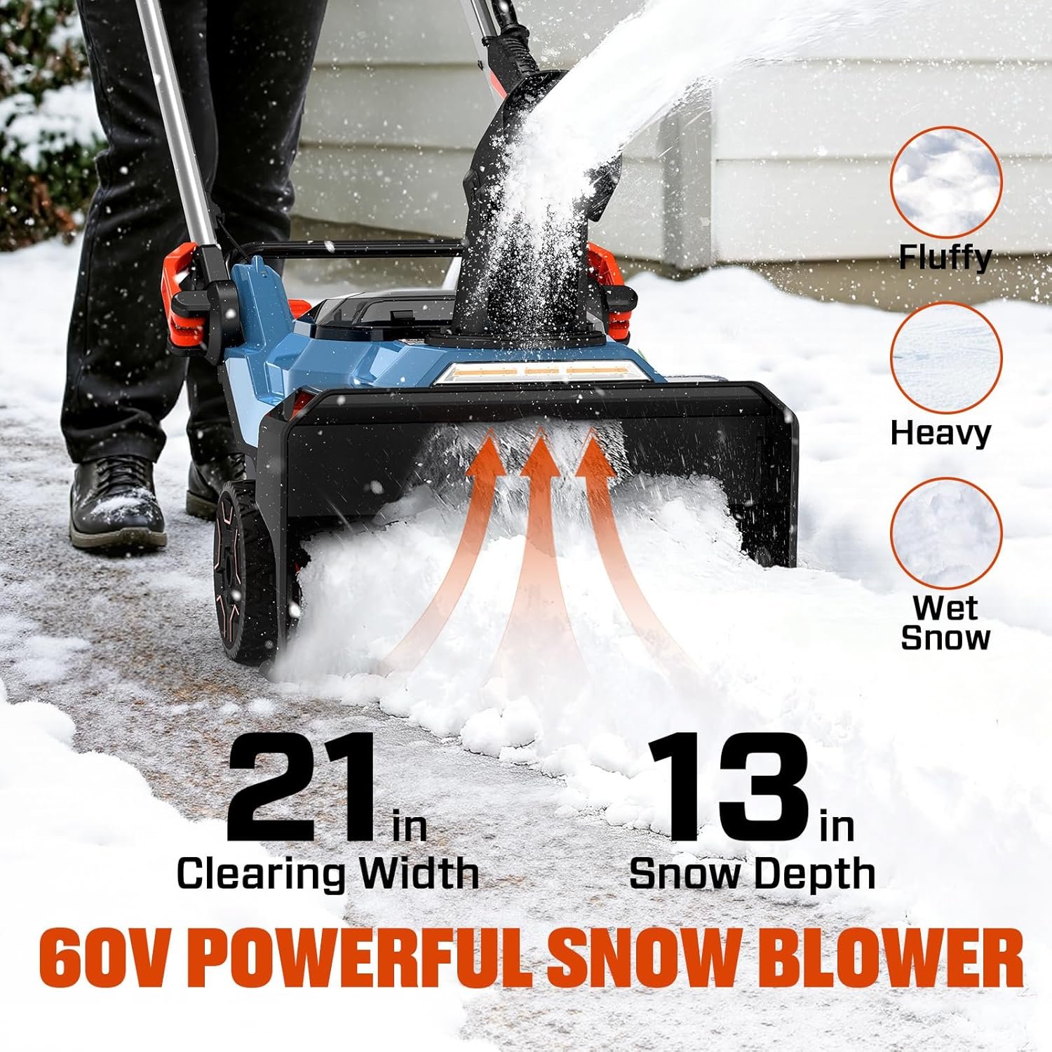 SENIX 60V 21″ Cordless Snow Blower, Steel Auger, 3500W Brushless Motor, Heated Handle,13″ Depth, 45FT Throw Distance, LED Lights, 16000mAh Batteries(Single Box) & Dual Port Charger,1200lbs/min