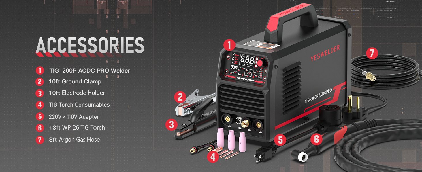 | Included Components | 13ft WP-26 TIG Torch, 220V > 110V Adapter, Ground Clamp&Electrode Holder, TIG Torch Consumables, TIG Welder |